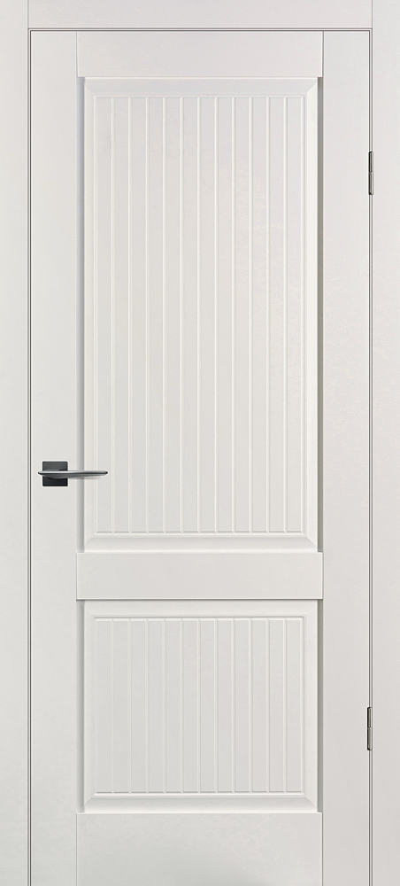 Царговое полотно, выполненное в гладком матовом покрытии, приятным на ощупь, обладающее высокими эксплуатационными характеристиками. Бескромочная технология. Полотно комплектуется объемной филенкой с фрезерованным рисунком "под рейку". В остекленных полотнах используется рифленное стекло с красивым прокатным узором в виде полос. Отлично смотрится в неоклассических и лофтовых интерьерах.